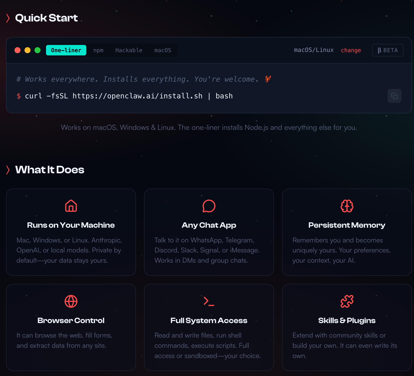 在OpenClaw官网,只需要一键复制代码就可以在Macbook上部署“龙虾”