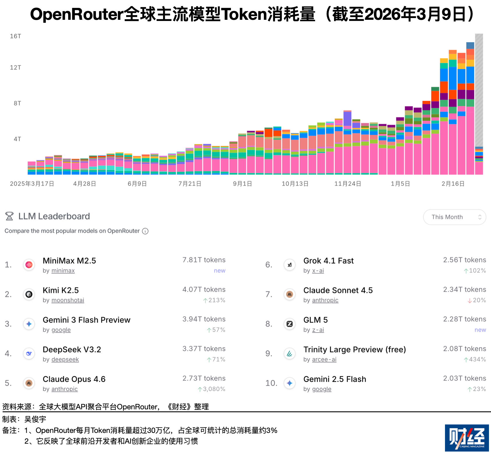 OpenRouter是全球大模型API聚合平台,集成了全球300多个主流模型,每月Token消耗量超过30万亿,占全球可统计的总消耗量约3%。它反映了前沿开发者和创业企业的使用习惯。OpenRouter 3月9日数据显示,MiniMax M2.5、Kimi K2.5、GLM 5的Token消耗量分别位居全球第一、第二、第八。中国模型公司首次在该平台月度统计中占据全球前三。