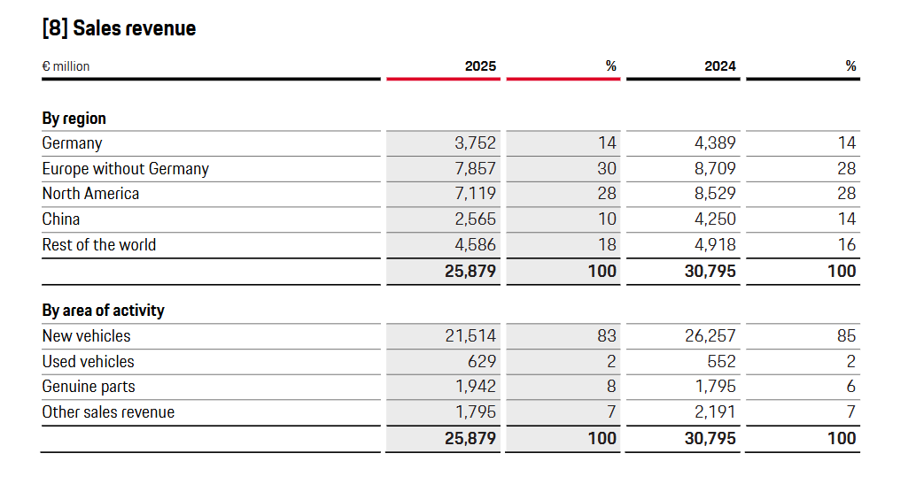 从全球市场来看,保时捷的平均单车销售收入从2024年的11.7万欧元提升至2025年的12.1万欧元,体现了保时捷坚持“重价值、轻规模”的战略。但是,中国市场2025年销售收入为25.65亿欧元,同比下滑近40%,显著高于同期销量跌幅,意味着平均单车销售收入较2024年进一步下滑。