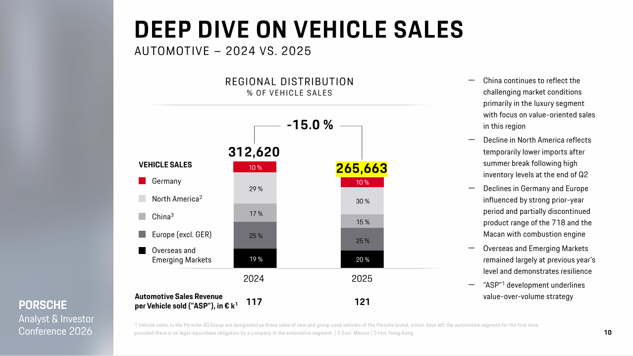 市场方面,在两大单一市场,中国豪华车领域的承压态势仍将持续,激烈的价格竞争,尤其是纯电动车型领域的价格竞争的影响将延续。白禹翰预计,2026年保时捷在中国的销量将进一步下滑至3万辆;而美国的关税政策预计也将维持现状。