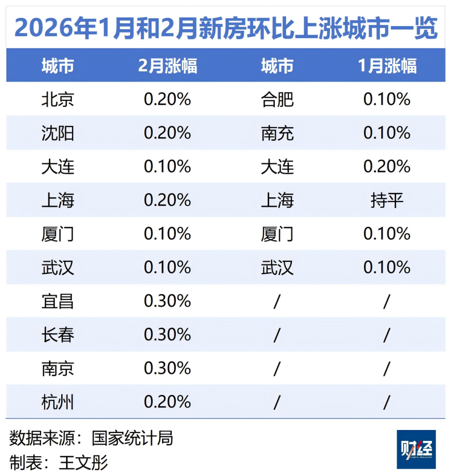 3月16日,国家统计局公布了70个大中城市商品住宅销售价格在2026年2月的变动情况。综合近三个月(2025年12月至2026年2月)的房价来看,新房市场连续三个月环比上涨或持平的城市有3个,分别为上海、合肥、武汉,其中武汉连续两个月上涨,涨幅均为0.1%。