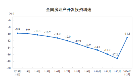 3月16日,国家统计局还公布了2026年1月-2月全国房地产市场基本情况,今年前两个月,全国房地产开发投资9612亿元,同比下降11.1%,降幅比上年全年收窄6.1个百分点。其中住宅投资7282亿元,下降10.7%,降幅收窄5.6个百分点。