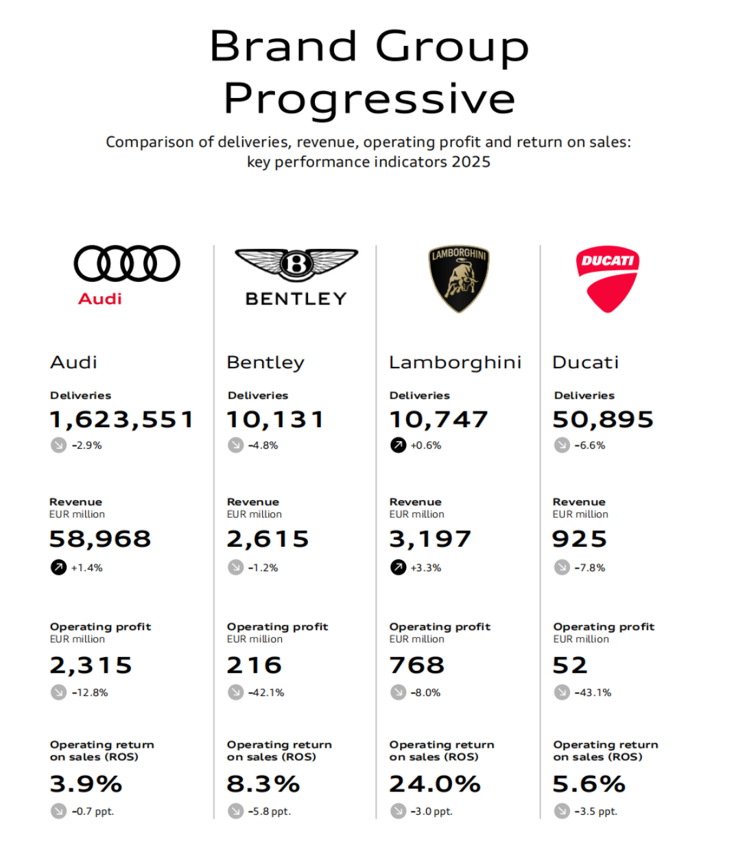 与此同时,其集团旗下的超豪华品牌矩阵呈现出显著的分化态势。其中,兰博基尼凭借核心车型的需求微增0.6%创下交付新高,展现出抗跌韧性;而处于电动化转型关键期的宾利与竞争压力与日俱增的杜卡迪,则双双遭遇销量下滑。