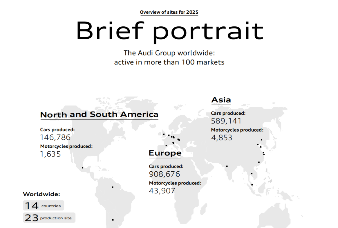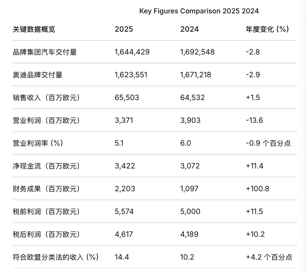 财报数据显示,奥迪集团2025财年实现销售收入655亿欧元,营业利润为34亿欧元,经营销售利润率达5.1%。尽管营收同比微增1.5%,但涨幅高达4.5%的销售成本导致销售毛利润同比下滑14.4%,核心汽车业务盈利能力承压。不过,得益于合资企业权益法收益等财务结果同比翻倍,集团最终实现税前利润11.5%、税后利润10.2%的正增长。然而,其全球交付量却同比下滑2.8%至164.4万辆。