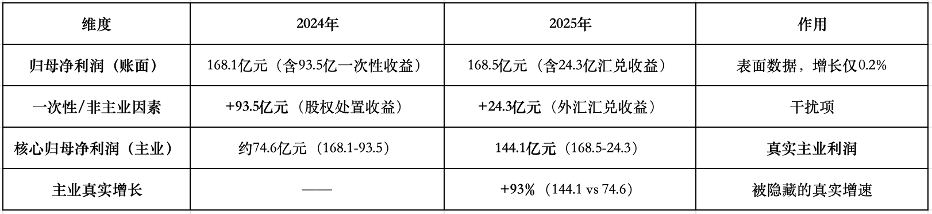 据了解,这个“核心”扣除了人民币汇率波动带来的24.3亿元外汇汇兑净收益。与此同时,2024年归母净利润曾包含93.5亿元的股权处置一次性收益,形成高基数。这两项因素共同导致账面利润增速失真,剔除两边的一次性“噪音”后,核心归母净利润从2024年的约75亿元(估算)跃升至2025年的144.1亿元,主业盈利能力实际实现了近翻倍的增长。