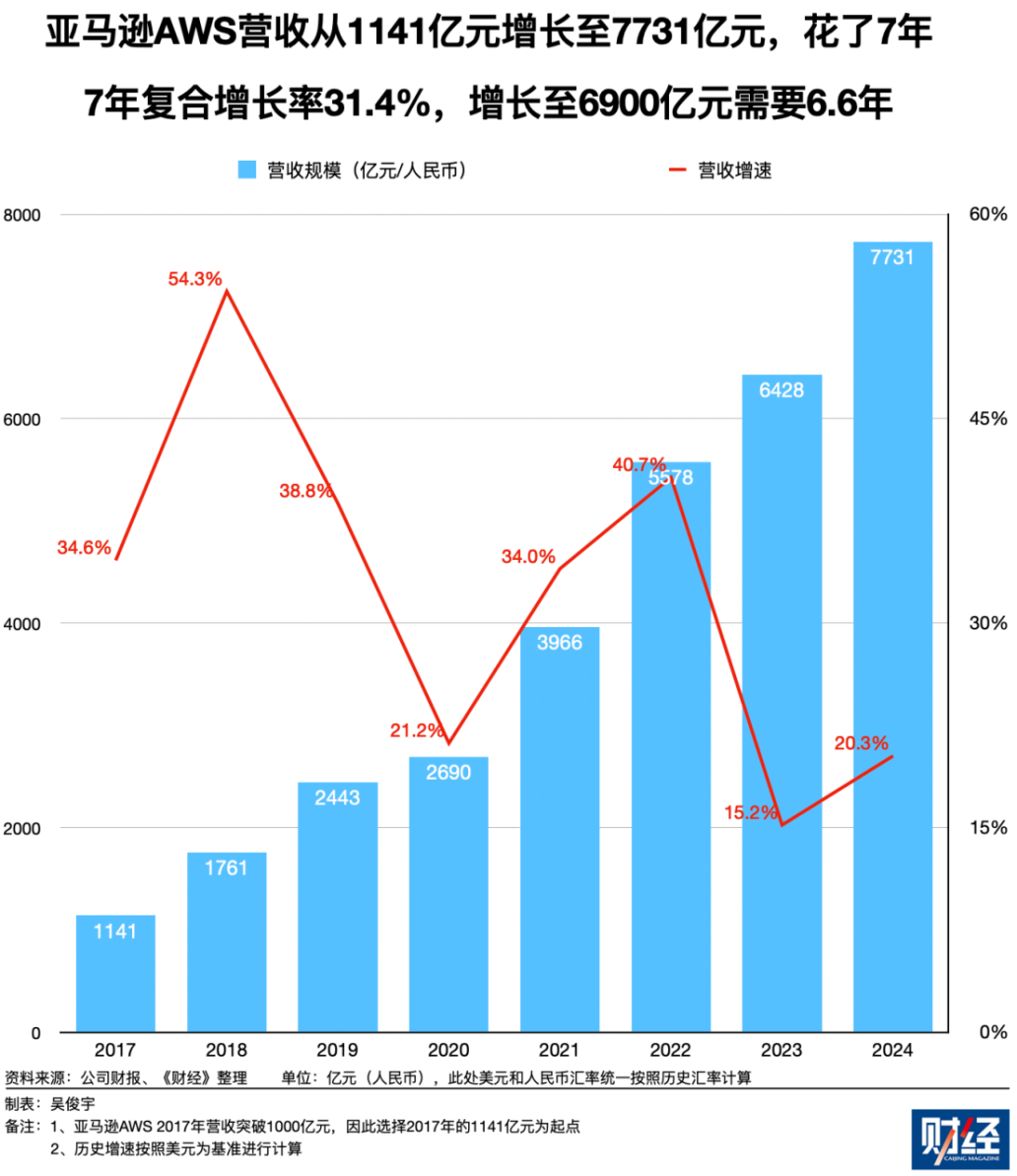 2017年-2024年,亚马逊AWS的营收从1141亿元增长至7731亿元。这花了7年,7年复合增长率约31.4%。照此计算,从1141亿元增长至6900亿元,大约用了6.6年。