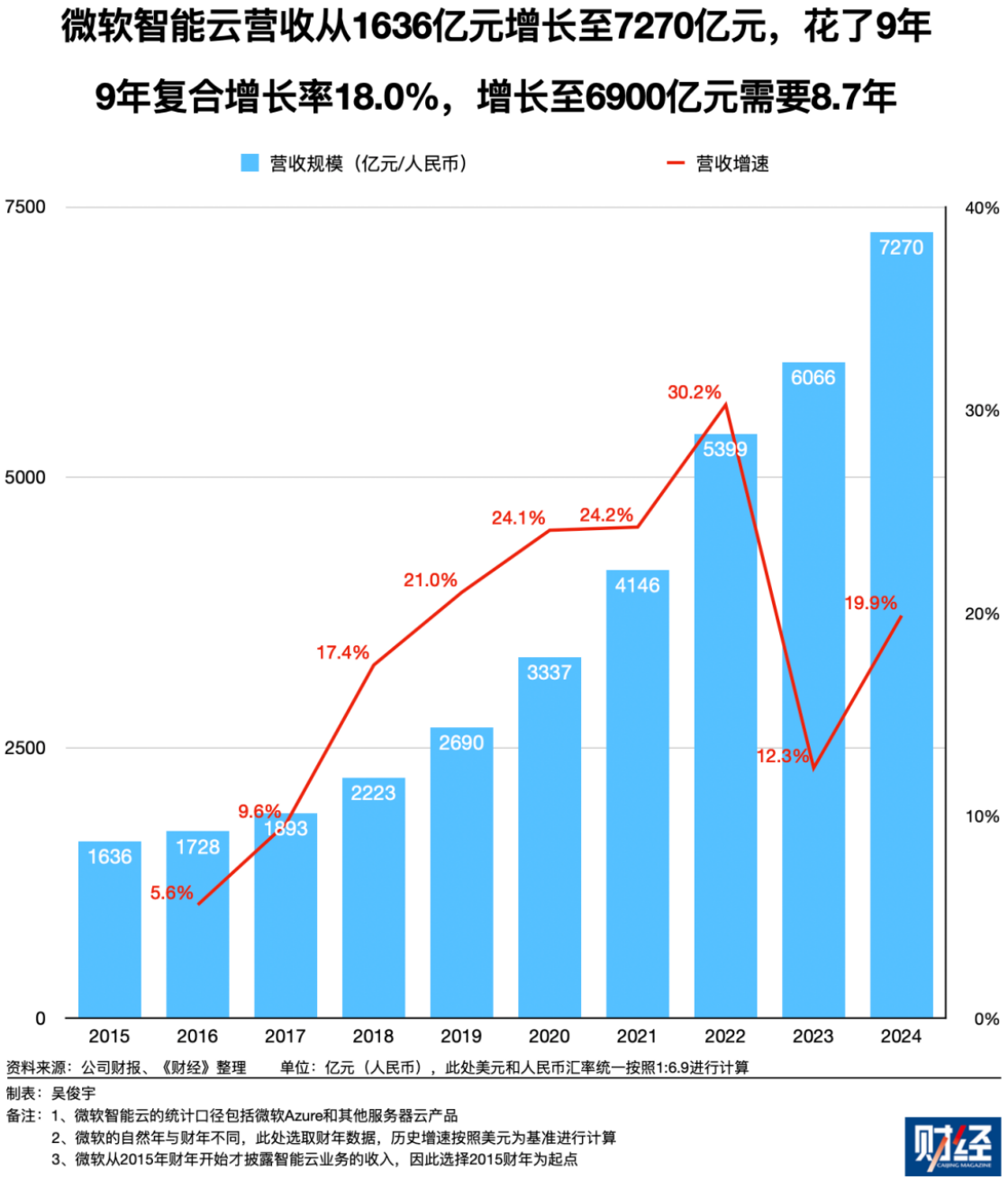 2015财年-2024财年(2014年7月初-2024年6月末),微软智能云的营收从1636亿元增长至7270亿元。这花了9年,9年复合增长率18.0%。照此计算,从1636亿元增长至6900亿元,大约用了8.7年。