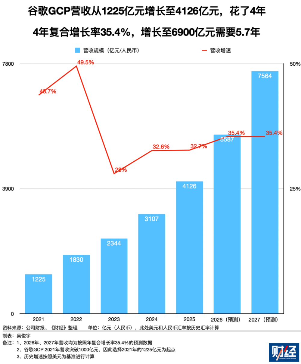 2021年-2025年,谷歌GCP的营收从1225亿元增长至4126亿元,4年复合增长率35.4%。照此计算,从1225亿元增长至6900亿元,大约需要用5.7年。