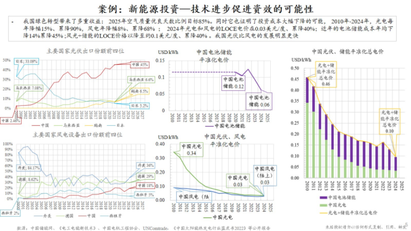 下图展示的是典型的成本技术经验曲线。以太阳能、风电设备制造为例,随着技术进步与流程持续优化,新能源装备的生产成本呈现快速下降趋势。这类固定资产的单位投资成本逐年降低,却能实现与以往相当甚至更优的产出效果,正是资产效率提升的典型实例。尽管这只是固定资产投资中的一个领域,但其原理具有普遍意义:通过技术进步与管理流程改善,有效降低投资成本、提升资产效率,在经济实践中具备充分可行性。