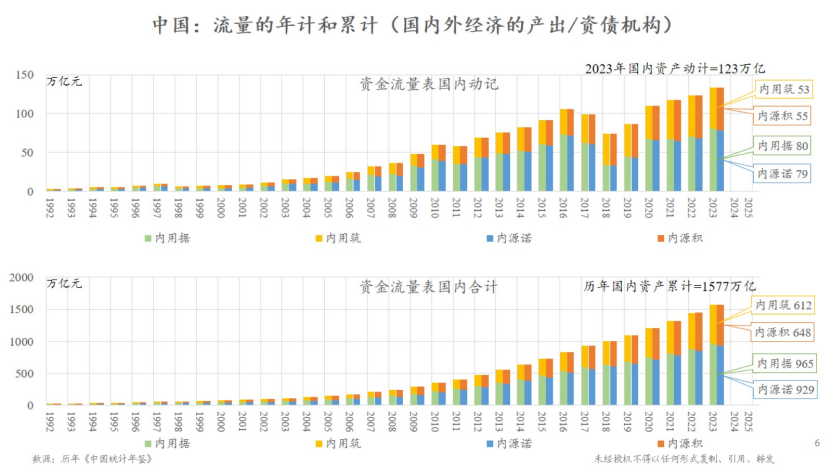 接下来,我们换一个角度来解读经济。根据国家统计局发布的资金流量表,表中记录的是每年年内各项经济活动的变动数据,既包括实物经济领域的生产、分配、消费、投资等流量指标,也涵盖金融领域的存款、贷款、保险、股票等金融活动数据。而将表中部分核心数据进行历年合理累积,比如将每年的投资数据,结合合理的折旧核算,就能形成存量层面的固定资产。这里我们重点介绍一个核心概念“筑”,它代表固定资产投资,即历年固定资产投资经过合理累积形成的存量规模。
