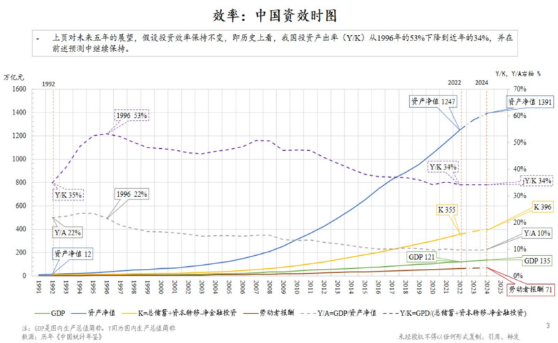 如果要定义经济整体效率,我们不妨把中国经济看作一座巨型工厂:工厂的总产出 Y 就是 GDP,而生产所依托的设备与资本,就是全社会总资产。用现价 GDP(Y)除以固定资产净值(K),即 Y/K,就可以作为衡量经济整体效率的核心指标。图中紫色虚线展示的正是这一比例:2008 年金融危机后呈现缓慢下降态势,近年来则基本稳定在 34% 左右。