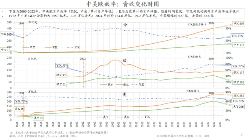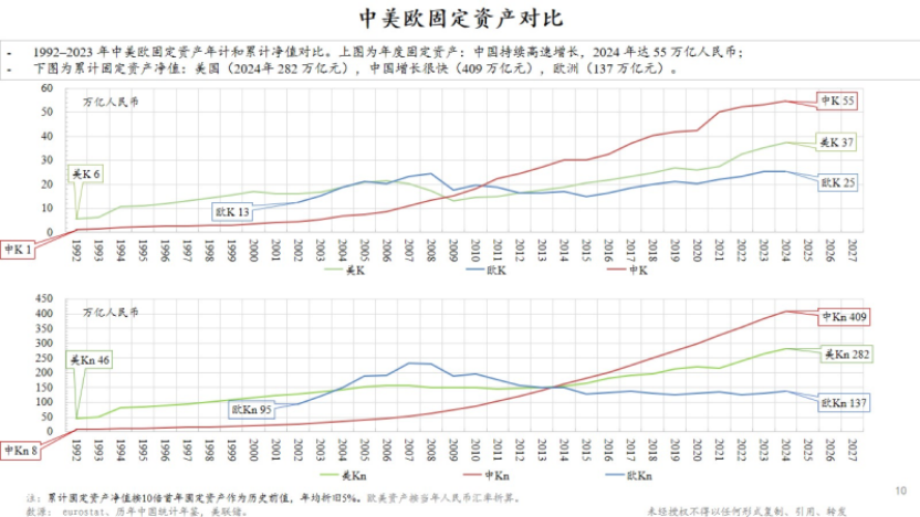 下图呈现的是效率曲线走势:2008 年国际金融危机后,我国效率水平有所回落,近几年则逐步企稳并基本保持平稳。对比来看,美国 GDP 与资产规模均实现增长,但其资产规模增速显著低于我国。这一对比进一步印证,经济发展速度与结构调整的核心,归根结底是效率问题。而欧元区的资产数据目前统计年份偏短,这里可作为一个探讨性的侧面证据,从有数据覆盖的近 30 年来看,其 GDP 增速整体偏缓;但在 2008 年金融危机及后续欧债危机期间,通过大规模资产清理、核销与估值下调,使得资产总量增速显著放缓。因此从指标上看,其资产效率呈现持续提升的态势。中美欧三者比较,从固定资产总值看(图上统一货币单位为人民币),中国固定资产净资产总值约为 400 万亿元,美国约为我国的 3/4,即 300 万亿元左右,欧洲则约为美国的一半。三者合计虽不完全等同于全球总量,但已基本能够代表全球主要经济体的资产规模。