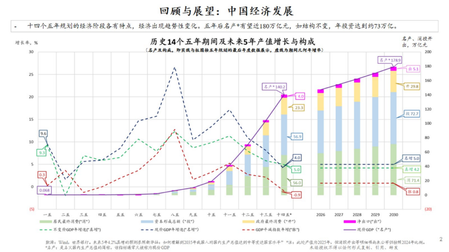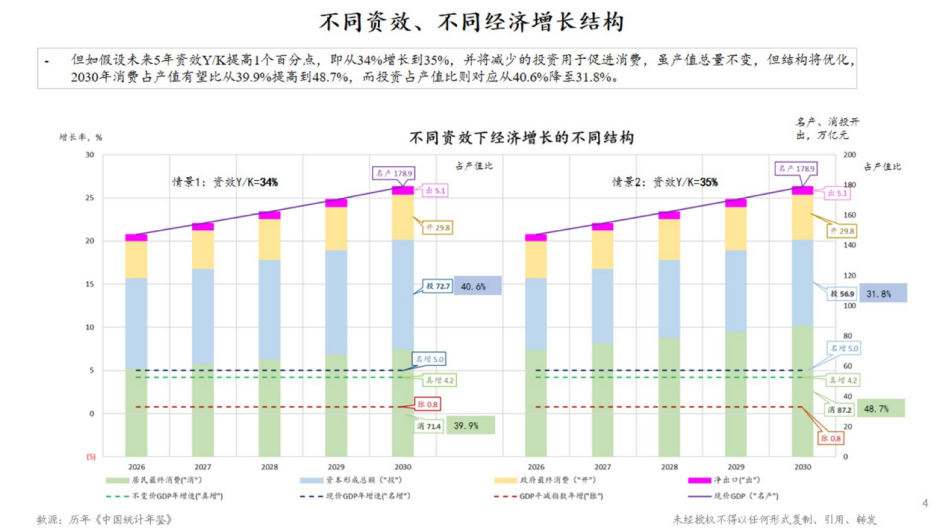 除总产值外,经济结构的演变同样至关重要。从图表中可以清晰看到,我国消费、投资、出口等关键指标在不同发展阶段呈现出显著变化。根据当前初步规划,若未来五年经济实现年均 4.5%—5% 的增长,到 2030 年我国经济总量将达到 179 万亿元。为便于后续深入分析经济规律与效率,我们先假定 2030 年的经济结构, 即投资与消费的比例关系,基本保持与去年一致。