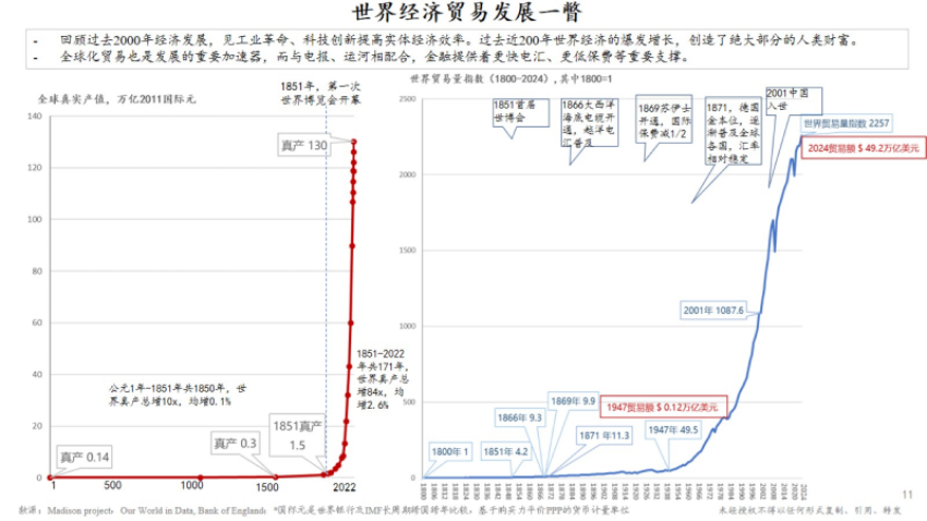 当然,这一切还离不开合理稳定的经济发展环境与规则框架。从这张全球贸易量曲线也能清晰看到,世界贸易真正实现跨越式增长,正是在1947 年之后。究其原因,二战的苦难让和平稳定成为全球共识,与此同时,关贸总协定(WTO 前身)、世界银行、IMF 等国际经济金融机制相继建立。尽管这些框架体系并非完美无缺,但在历史上确实为全球贸易与金融活动提供了相对稳定的制度环境。正是在和平与规则的双重支撑下,世界经济贸易才得以快速发展。