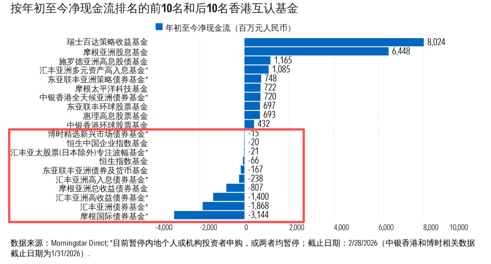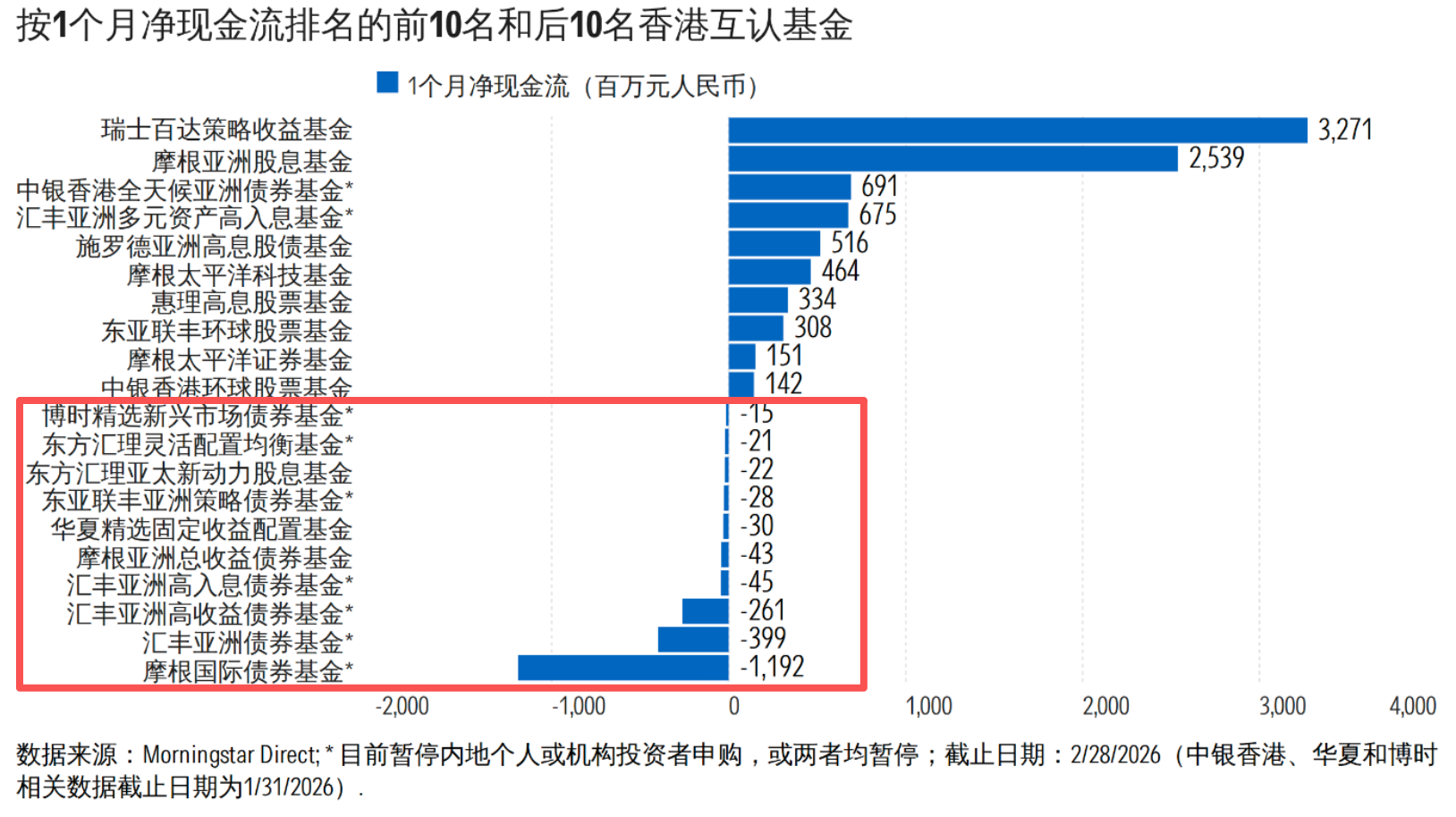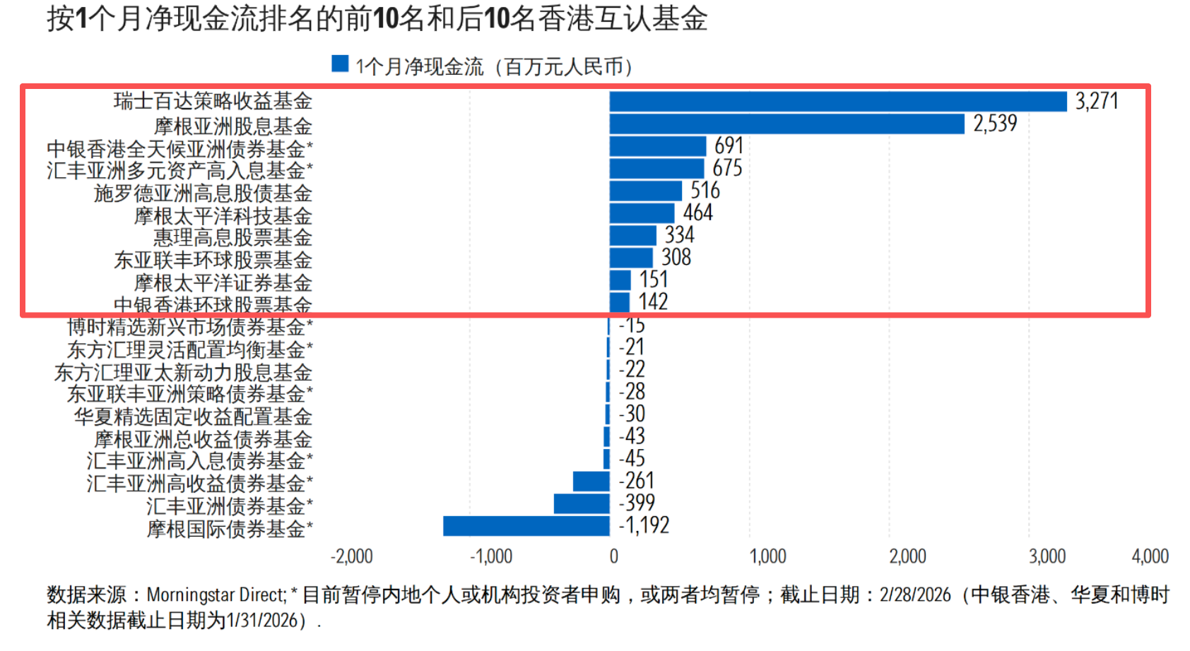 从2月数据看,香港互认基金市场并不缺资金,但增量资金的去向已明显分化。晨星数据分析显示,瑞士百达策略收益基金、摩根亚洲股息基金两只产品单月分别吸金32.71亿元、25.39亿元,带动混合型和股票型产品继续站在资金流入前列;与之对应,债券型基金整体仍处于承压区间,摩根国际债券基金、汇丰旗下多只亚洲债券基金继续出现在净流出名单前列。