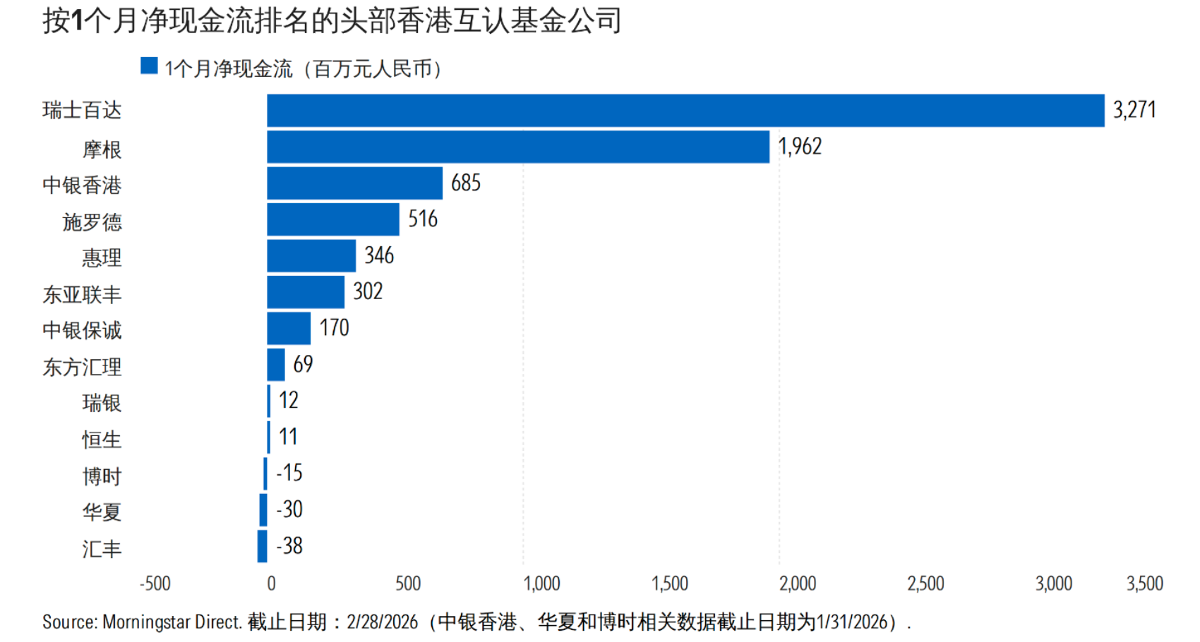 从产品端延伸到机构端,这种趋势同样明显。按2月单月净现金流统计,瑞士百达以32.71亿元位列首位,摩根以19.62亿元位列第二,中银香港、施罗德、惠理、东亚联丰等机构也保持净流入。若看年初至今,瑞士百达累计净流入80.24亿元,摩根为37.29亿元,东亚联丰、施罗德、中银香港、惠理均录得正流入,汇丰则净流出24.42亿元。