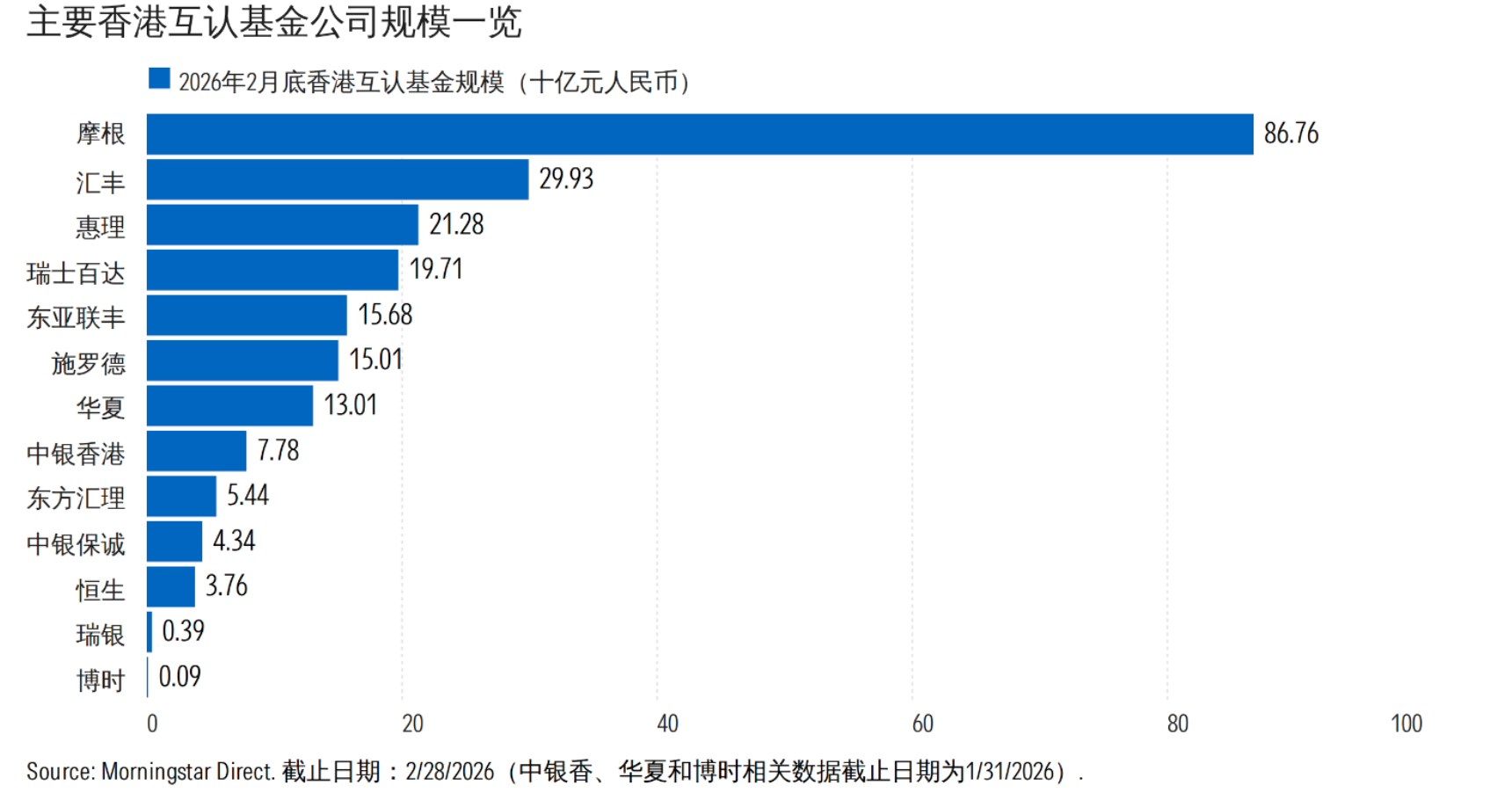 在产品分化持续加大的同时,头部主导的格局并没有改变。月报显示,截至2月末,摩根互认基金资产规模为867.6亿元,市场份额超过40%,仍稳居第一;汇丰和惠理分别以299.3亿元、212.8亿元位列第二、第三;瑞士百达资产规模为197.1亿元,东亚联丰、施罗德、华夏则处于100亿元以上区间。