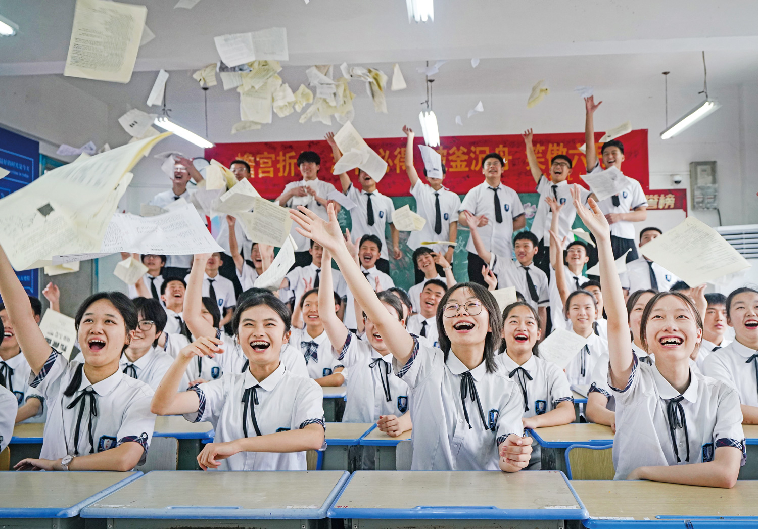 2025年6月22日,武汉十一崇仁初级中学(京汉校区),刚刚结束中考的学生们集中返校拍摄班级毕业照。图/IC