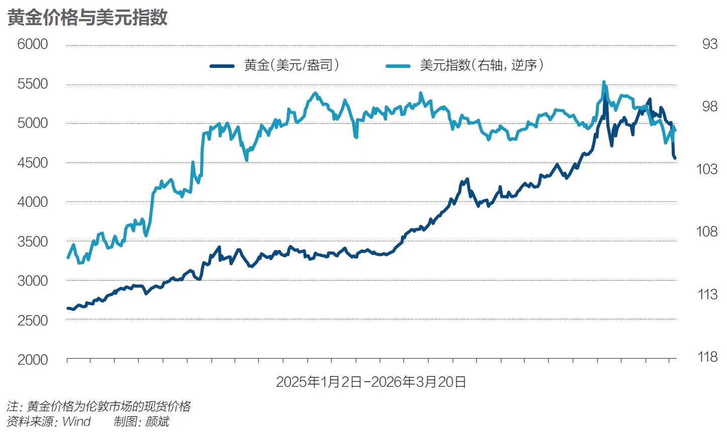 当前,中东地缘政治局势依然胶着,前景晦暗不明。按照传统的市场逻辑,地缘政治风险的急剧攀升理应成为黄金等避险资产的强劲催化剂。然而,近期黄金价格的走势却与这一逻辑背道而驰:3月以来,黄金价格下跌幅度已超过15%。特别是在3月23日,在市场高度担忧美以军事打击伊朗进一步升级的背景下,黄金价格盘中甚至一度下跌逾8%。直至特朗普声称与伊朗进行了“强有力”的对话,黄金价格才V型反弹,并且在3月24日和25日随着地缘局势缓和的预期而连续回升。