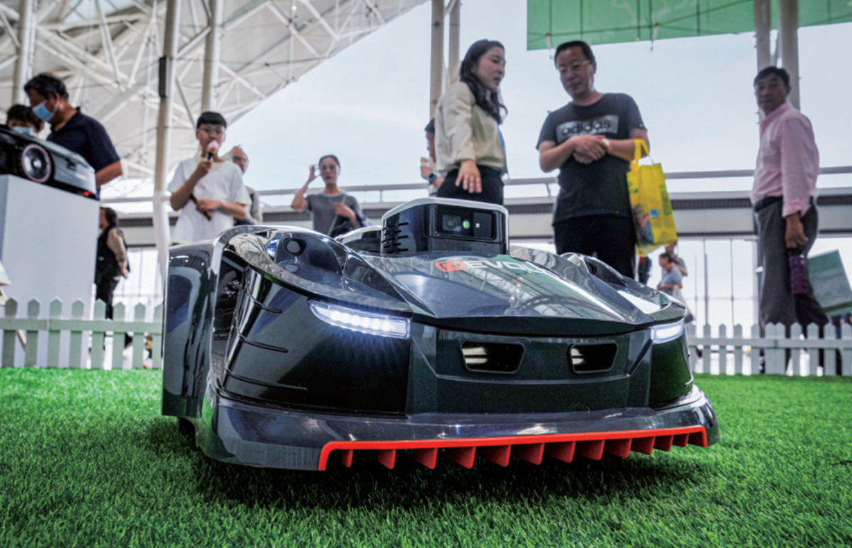 2025年4月19日,2025年“外贸优品中华行江苏站”展览上的智能割草机器人 图/新华