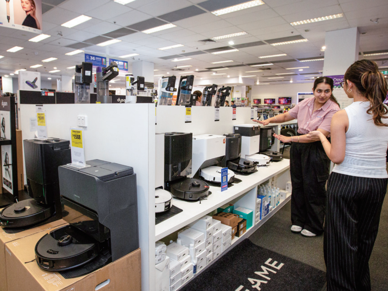 2025年10月13日,在澳大利亚悉尼市中心一家电器商场内,店员向顾客介绍中国品牌扫地机器人 图/新华