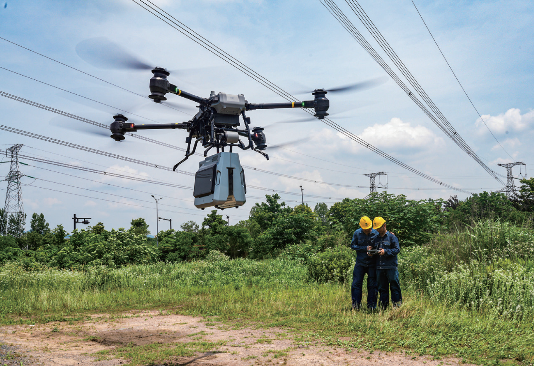 2025年5月22日,在位于浙江省诸暨市的500千伏线路现场,工作人员操作搭载了地线断股带电修补机器人的大疆无人机起飞,对线路进行修复 图/新华