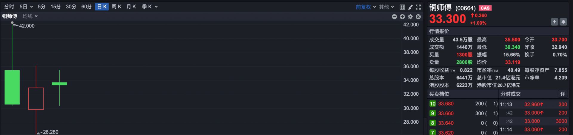 4.铜师傅(HK00664):公司是一季度最后一家上市的新股,首日即大幅破发49.17%,成为今年一季度首日表现最差的新股。
