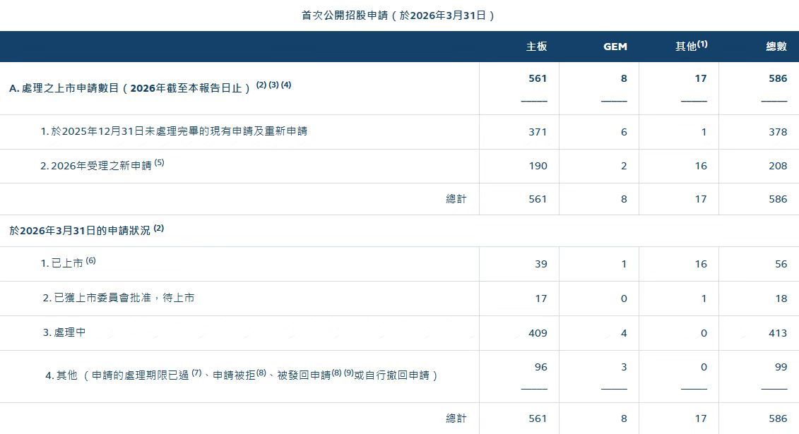 据港交所公布的数据,截至3月31日,除了已上市的39家主板公司外,已获上市委员会批准,待上市的主板公司有17家,仍在处理中的主板IPO申请有409家。