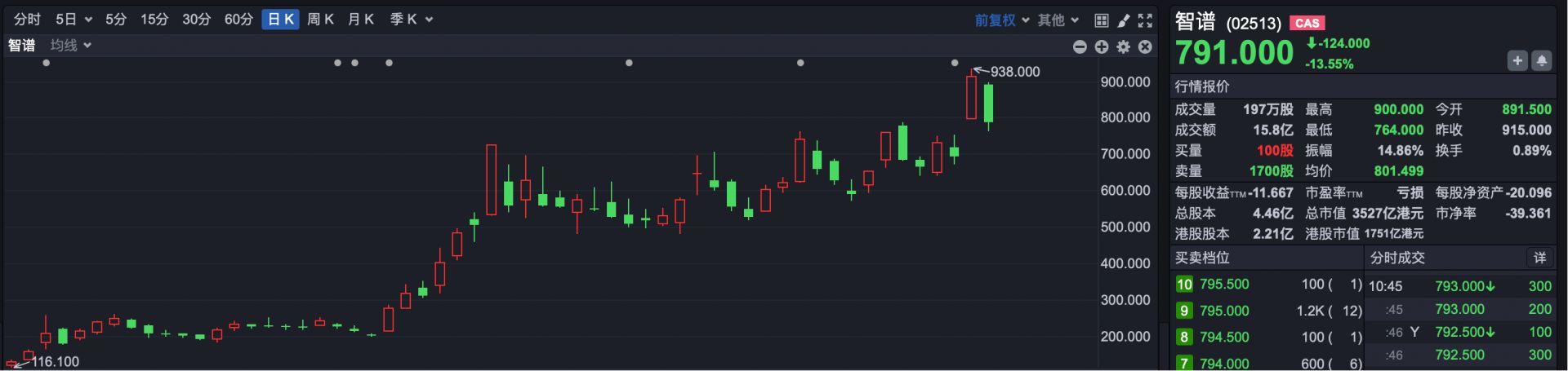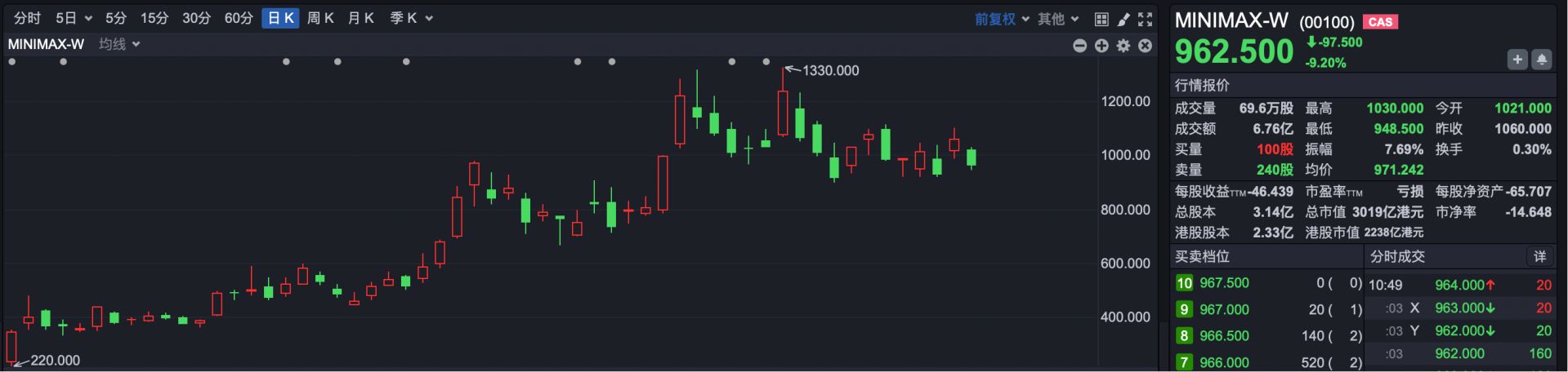 2.MINIMAX-W(HK00100):截至4月1日,MiniMax报收于1060港元,较发行价165港元上涨542%,上市以来最高价一度涨到1330港元,一举成为港股最高价个股。