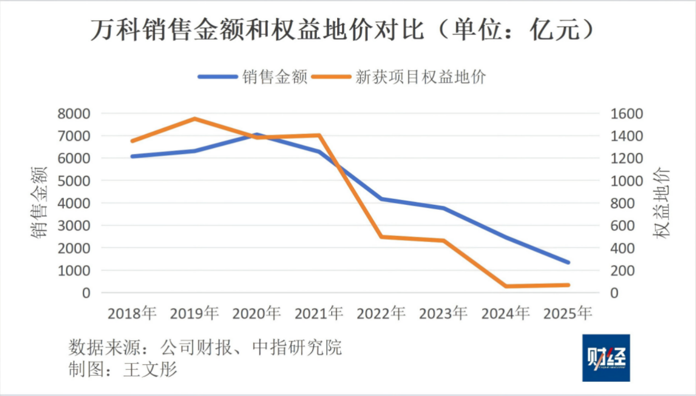 财报显示,2025年,万科的销售金额为1340.6亿元,同比下降45.5%,仅为2020年的巅峰期(7041.5亿元)的19%;结算收入为1701.08亿元,同比下降39.0%;结算毛利率为8.1%,同比下降1.4个百分点。为此,万科对存货计提了208.26亿元的新增减值储备,同比增加195%。