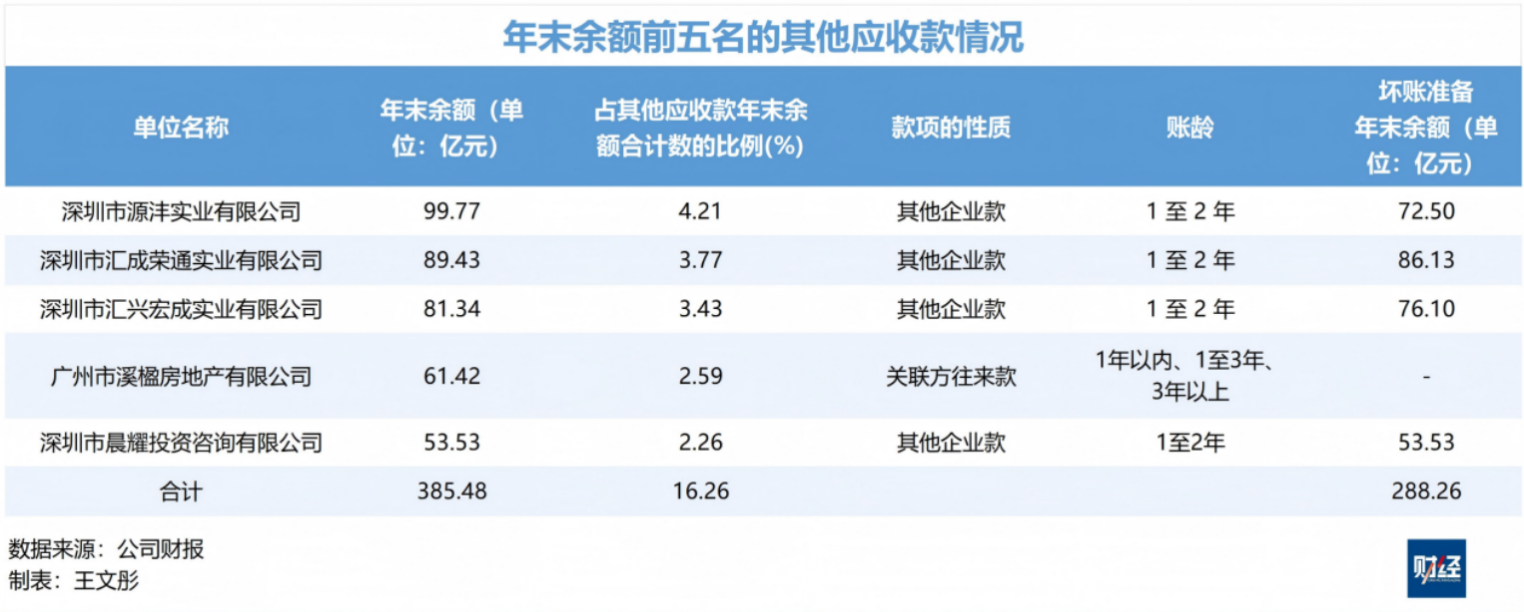 在财报中,万科披露了其他应收款中钱款余额排在前五名的公司名单。五家公司中,除广州市溪楹房地产有限公司,其余四家都计提了大额坏账。经股权穿透后,这四家均与万科庞大的体外投融资体系有关。