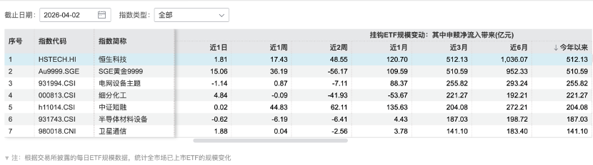 Wind数据显示,截至4月2日,今年以来恒生科技是ETF资金净流入最大的指数,达到512亿元,净申赎流入金额甚至超过了黄金。