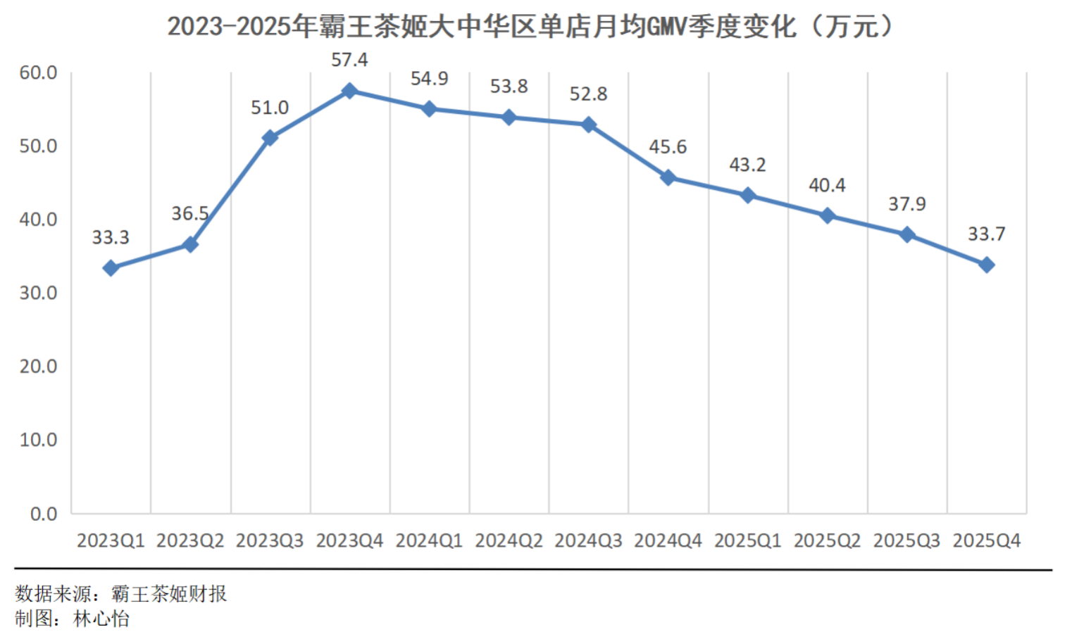 在整体业绩放缓的情况,同店月均GMV一路下行,从2025年一季度的43.20万元降至四季度的33.74万元。若将时间线拉得更长,相比有记录以来的2023年四季度的57.4万元,两年来,霸王茶姬的同店月均GMV已经跌去超过四成。