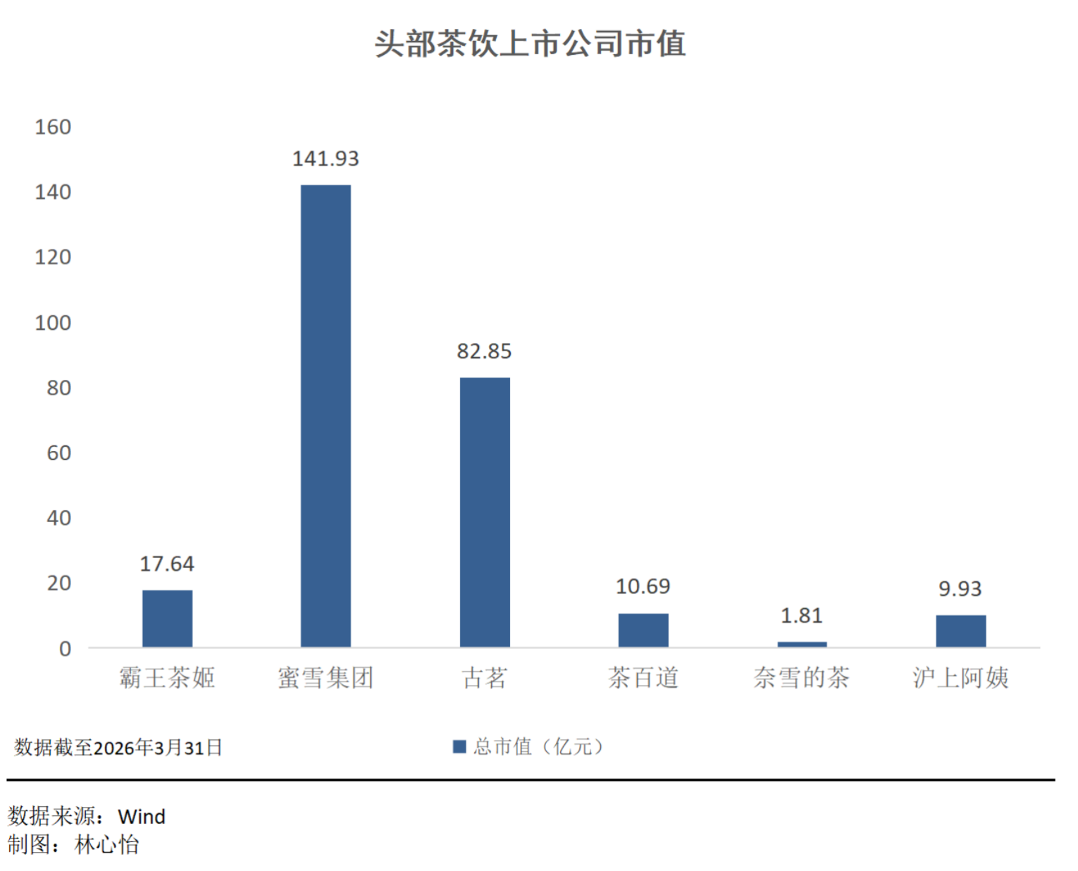从总市值来看,截至2026年3月31日,霸王茶姬17.64亿美元,在六家茶饮上市公司中排名第三。这个第三名与第一名蜜雪集团141.93亿美元和第二名古茗82.85亿美元的差距较大,而与后来者的差距较小。