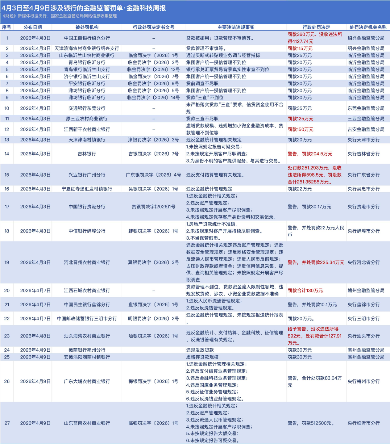 在4月3日至4月9日央行与国家金融监督管理总局官网披露的27张涉及银行的罚单中,有9张罚款金额达到百万级: