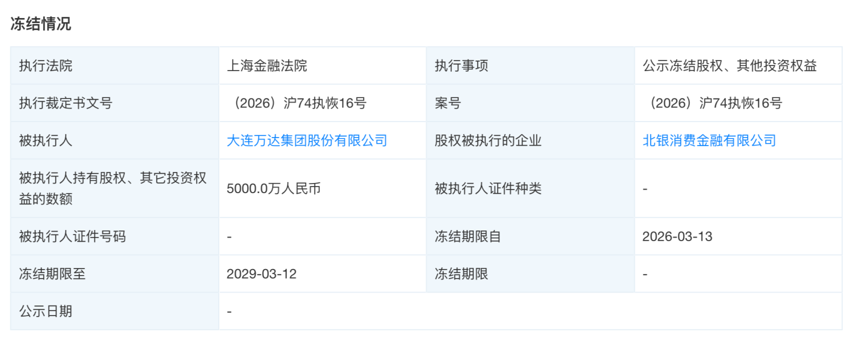 近日,天眼查显示,大连万达集团股份有限公司所持北银消费金融有限公司5000万股权被上海金融法院冻结,冻结期为2026年3月13日至2029年3月12日。