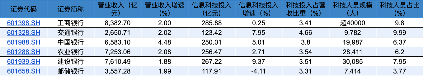 过去一年,工商银行、农业银行、建设银行、中国银行、交通银行、邮储银行等六家国有大行科技投入力度整体进一步强化。