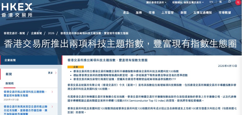4月13日下午,港交所宣布指数组合新增2只“60/40”科技类指数,包括香港交易所韩国交易所半导体指数,香港交易所科技及美国科技100指数。
