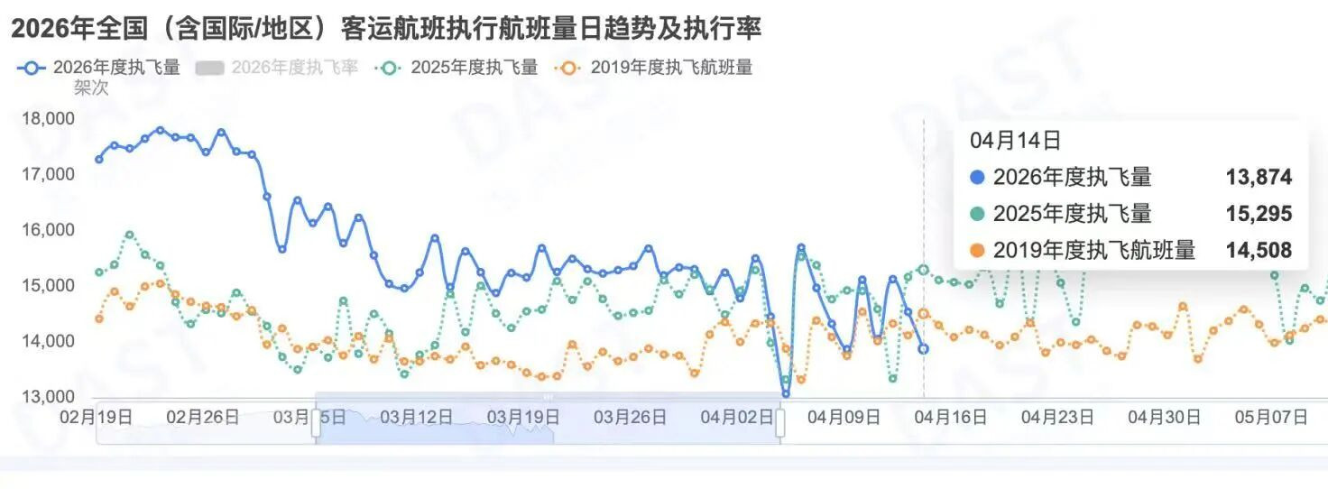 《财经》记者观察近期全国客运航班执行量发现,从3月开始,航班执行量就有所下滑,从2月的日均超过17000架缩减到16000架左右,随后小幅继续下滑,一路跌破单日15000架、14000架的关口,4月14日的最新航班执行量已经低至13874架,触及近期最低。