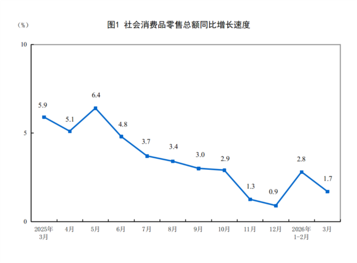 从单月看,3月社会消费品零售总额同比增长1.7%,较1月-2月(2.8%)回落1.1个百分点,显示当前消费修复仍处于“弱复苏”阶段,居民消费意愿和能力的全面恢复还需要时间。