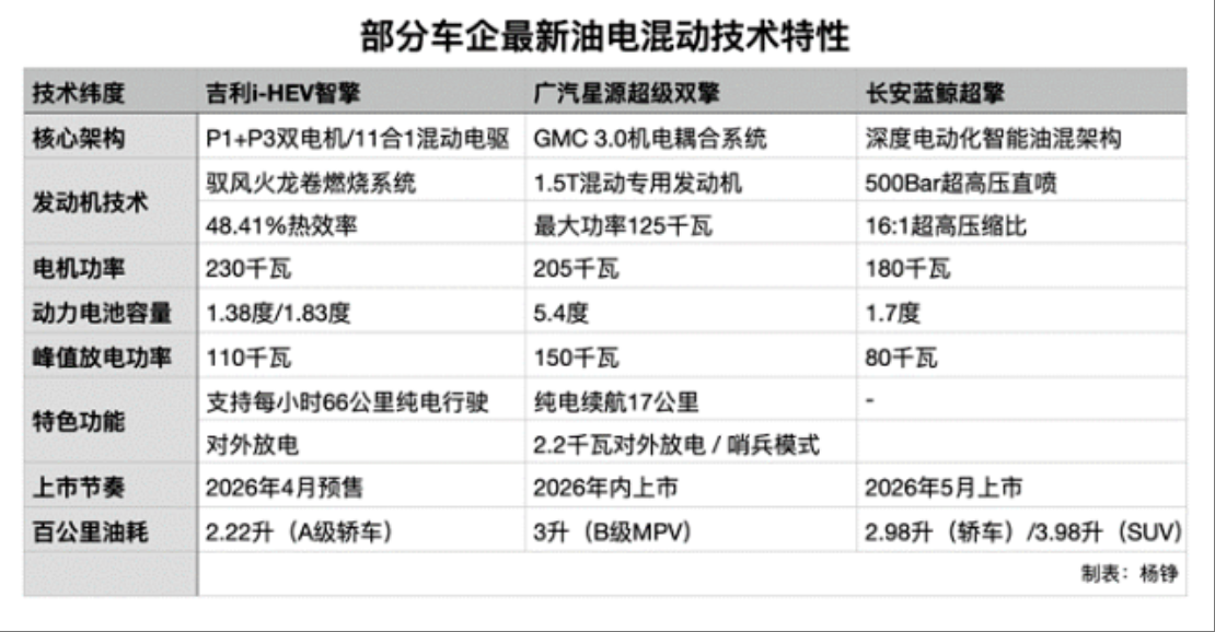 4月13日,吉利汽车集团(00175.HK)正式发布全球新一代AI油电混动技术方案——i-HEV智擎混动。此前一天,广汽集团(601238.SH)在2026广汽科技日期间发布了星源超级双擎。再回溯几日,长安汽车(000625.SZ)在3月30日正式发布了蓝鲸超擎混动技术。