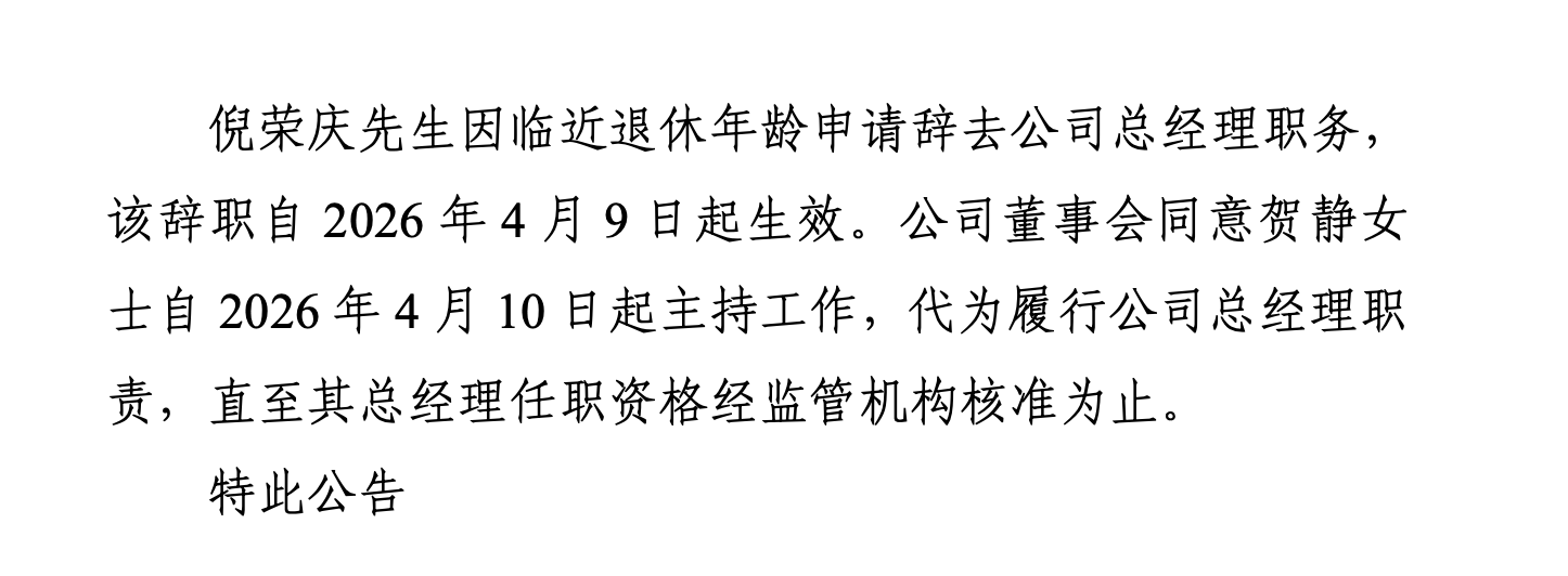 4月17日,平安消费金融在官网发布公告称,原总经理倪荣庆因临近退休年龄辞任,自4月10日起,由贺静主持公司工作、代为履行总经理职责,待监管核准其任职资格后正式履职。