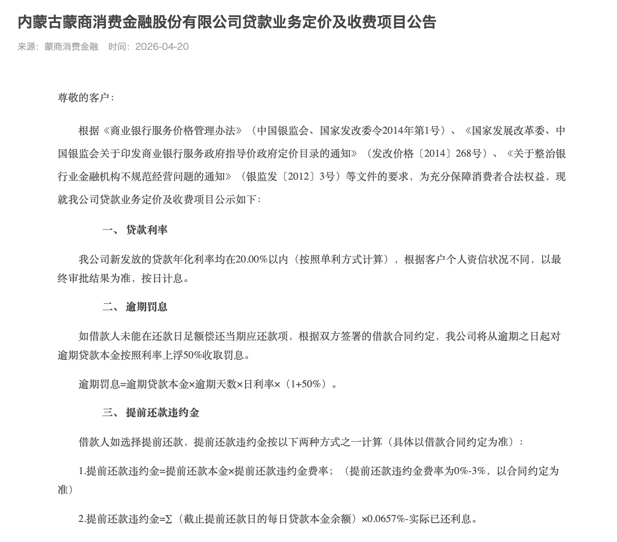 4月20日,蒙商消费金融官网发布的《贷款业务及收费项目的公告》显示,蒙商消费金融新发放的贷款年化利率均在20%以内(按照单利方式计算),根据客户个人资信状况不同,以最终审批结果为准,按日计息。