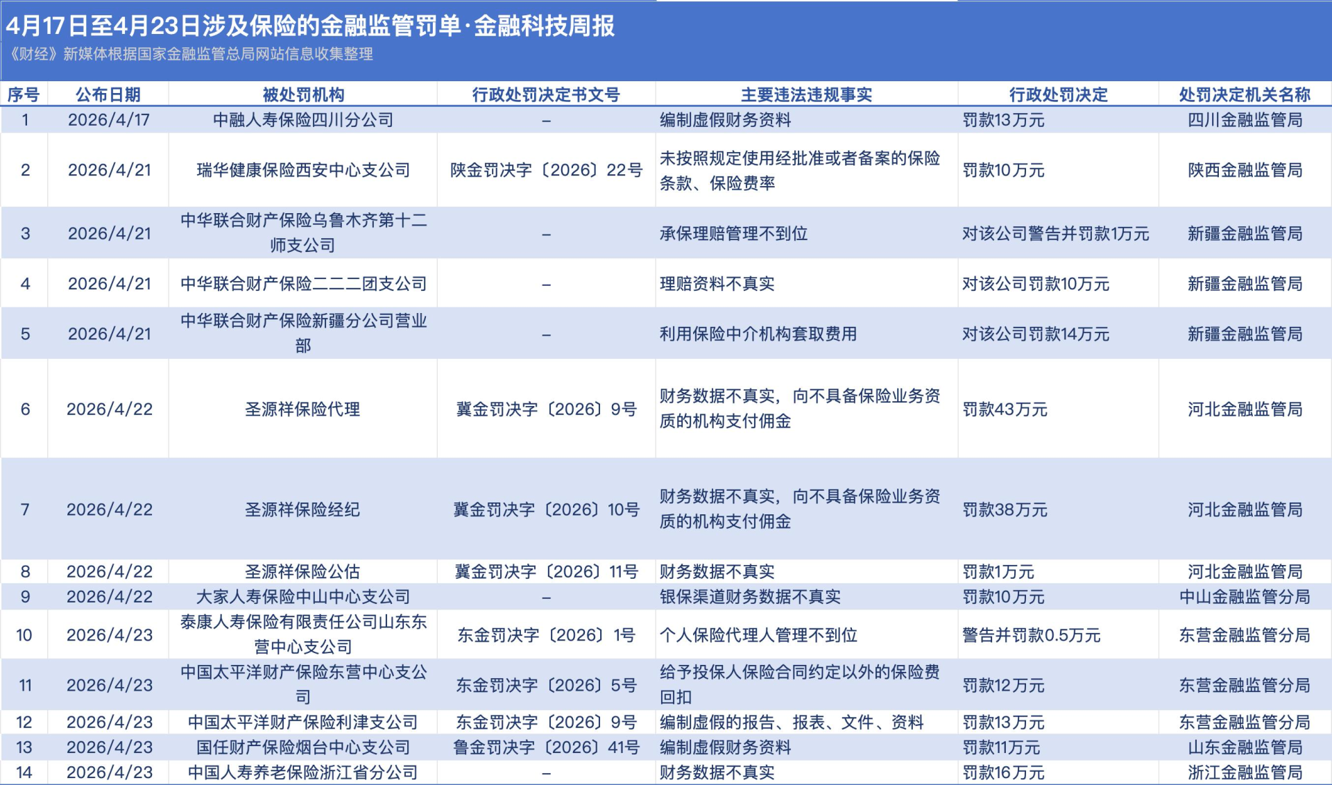 4月17日至4月23日,国家金融监督管理总局官网披露了14张涉及保险公司的罚单。