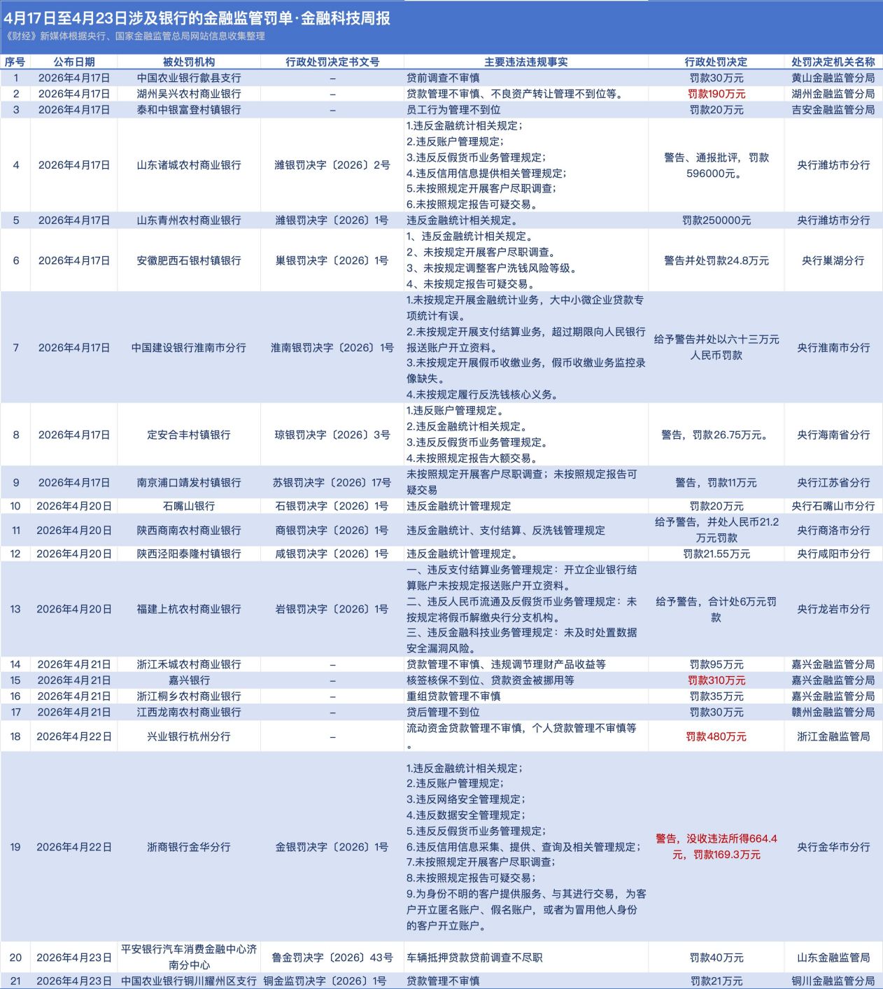 4月17日至4月23日,央行、国家金融监督管理总局官网披露21张涉及银行的罚单。