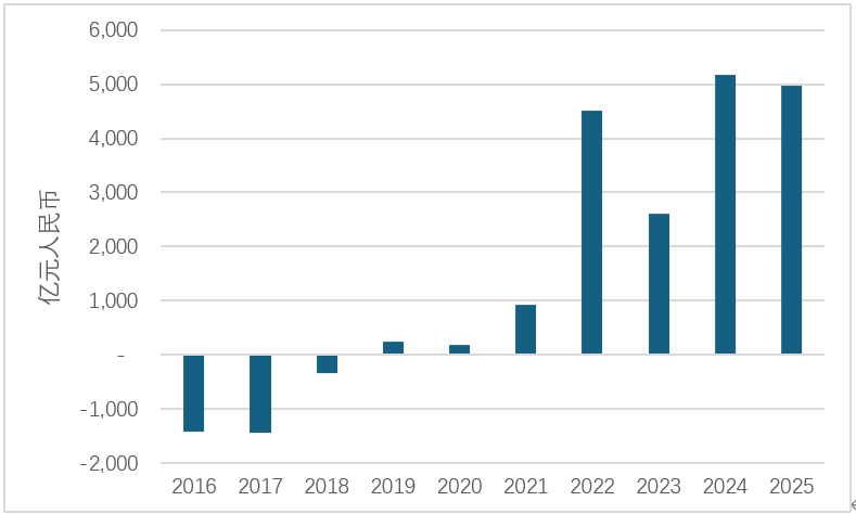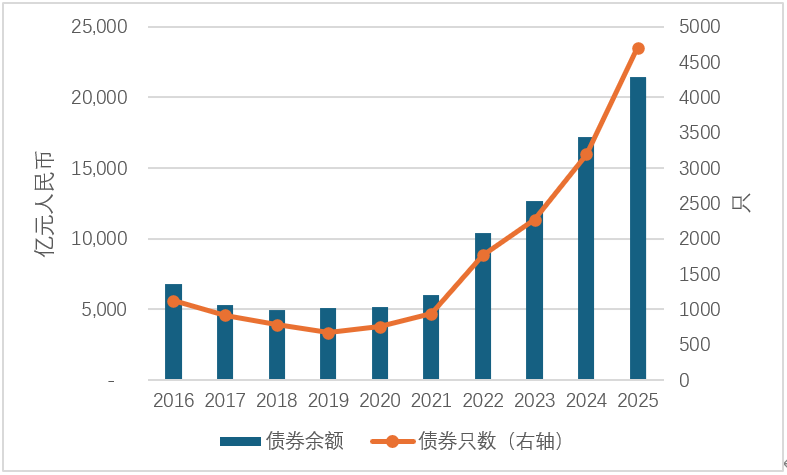 如图1所示,点心债市场在2019年回暖,并从2022年起进入快速增长阶段。2022年至2025年,点心债年度发行规模分别为7499亿、9944亿、13127亿与14123亿元,发行只数分别为1186、1539、2236与2948只。如图2所示,从2022年起至今,点心债年度余额迭创历史新高,2022年突破1万亿元达到10429亿元,2025年突破2万亿元达到21447亿元。如图3所示,点心债年度净融资额在2016年至2021年期间累计为-1851亿元,但在2022年至2025年期间分别为4516亿、2601亿、5177亿与4969亿元。