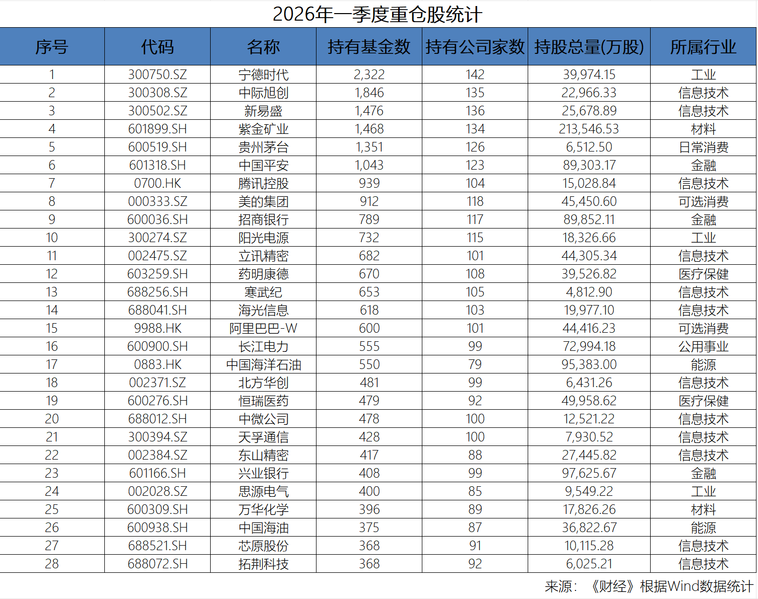 根据Wind(万得)数据统计,2026年一季度,中际旭创凭借较高的基金持有数量位居全市场第二,仅次于宁德时代,新易盛紧随其后位列第三,两大光模块龙头稳居公募重仓“第一梯队”。此外,数据显示,通信行业在一季度主动权益基金加仓排名中位列首位。