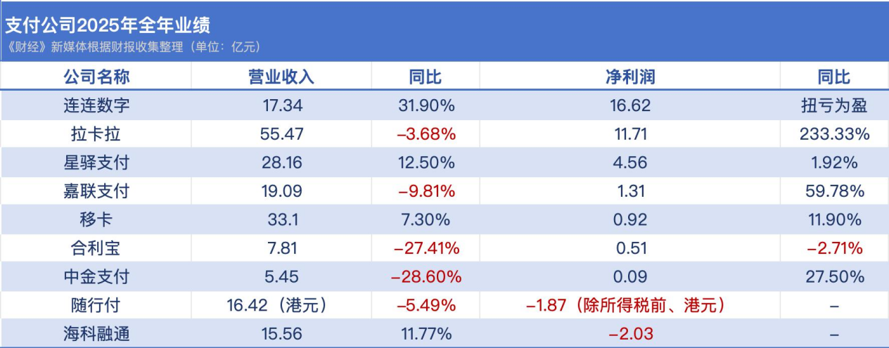 3家上市支付公司中,除拉卡拉2025年营收下降外,移卡与连连数字均营收净利双增。
