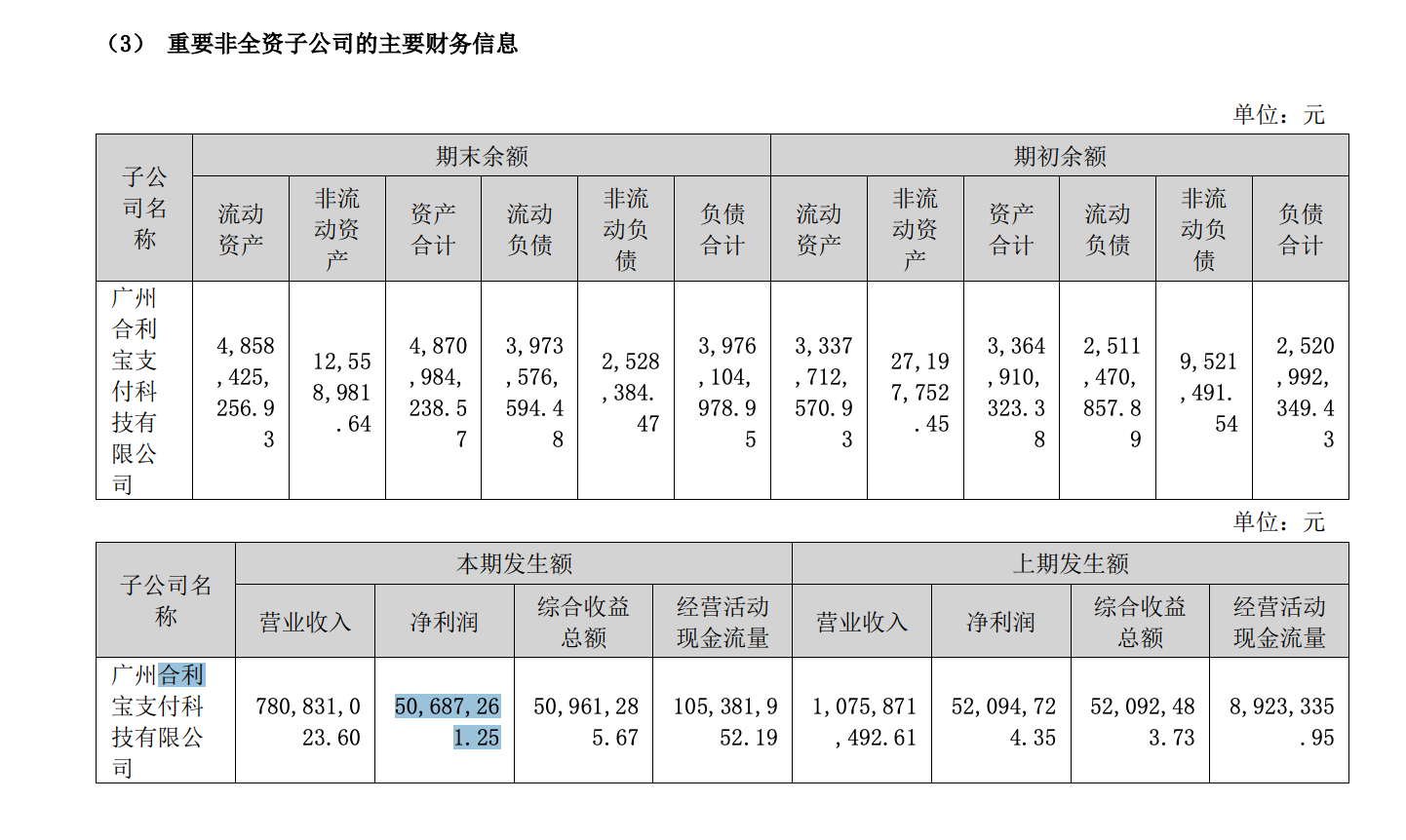 2025年,合利宝、中金支付营收也出现下滑。合利宝营收7.81亿元,同比下降27.41%;净利润0.51亿元,同比下降2.71%。拉长时间看,合利宝2023年增收不增利(营收同比增7.30%至17.20亿元,净利同比降68.14%至0.35亿元);2024年净利虽回升48.62%至0.52亿元,但营收同比下滑37.73%至10.71亿元。