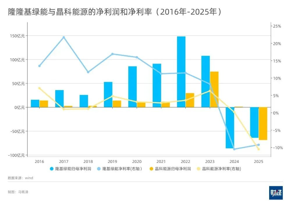 2026年一季度数据仍不乐观。季报显示,晶科能源2026年一季度营业收入为122.48亿元,同比下降11.52%,归母净利润为负13.50亿元,2025年同期为亏损13.9亿元;隆基绿能营业收入为111.92亿元,同比下降18.03%,归母净亏损19.20亿元,同比亏损增加34.20%。